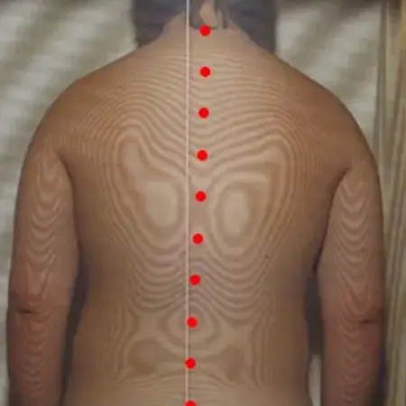 背骨の曲がりがあると、首に負担が多くかかります。モアレトポグラフィーとサーモグラフィーを撮影することで、背骨の歪みと筋肉の負担が他覚的に判定できます。 ※写真は左後方からの、むち打ち症です。背中が右側に側彎することで、頭部を重心線に戻そうと頸椎が左に曲がります。腰は頸椎の痛みから筋緊張が高まり、頸椎と右肩に炎症が広がります。頭痛は右側に起こります。