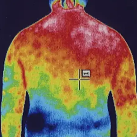 筋肉の緊張が高まると、血流が悪くなり低温になります。逆に、不安定な部分は筋肉の炎症が強くなるので高温になります。もともと背骨に筋肉の緊張の強弱がある患者様が、むち打ち症になると、症状が慢性化するケースが多くあります。緊張の高まる腰の部分の可動性を取り戻すことで、むち打ち症の首の部分の負担を軽減することができます。