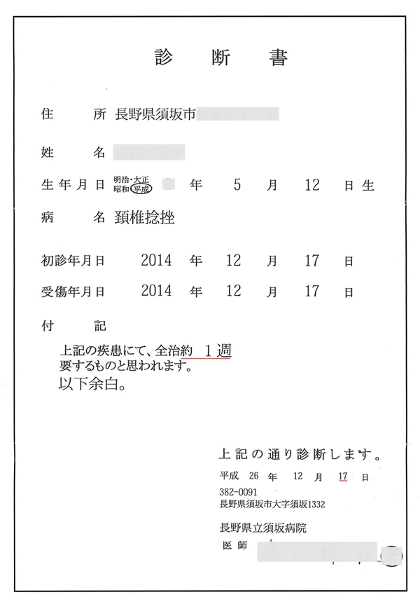 たとえば、警察に提出した診断書は全治一週間。でも、むち打ちは一週間では治りません。