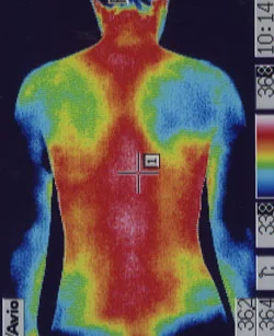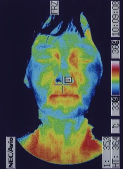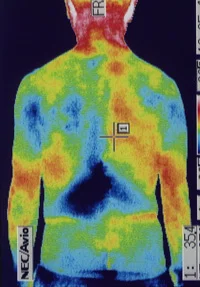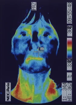 サーモグラフィー(治療前)では首から顔の血液循環が悪化しているのが分かります。難治性ですが、比較的、鍼治療が良く効くむち打ちです。